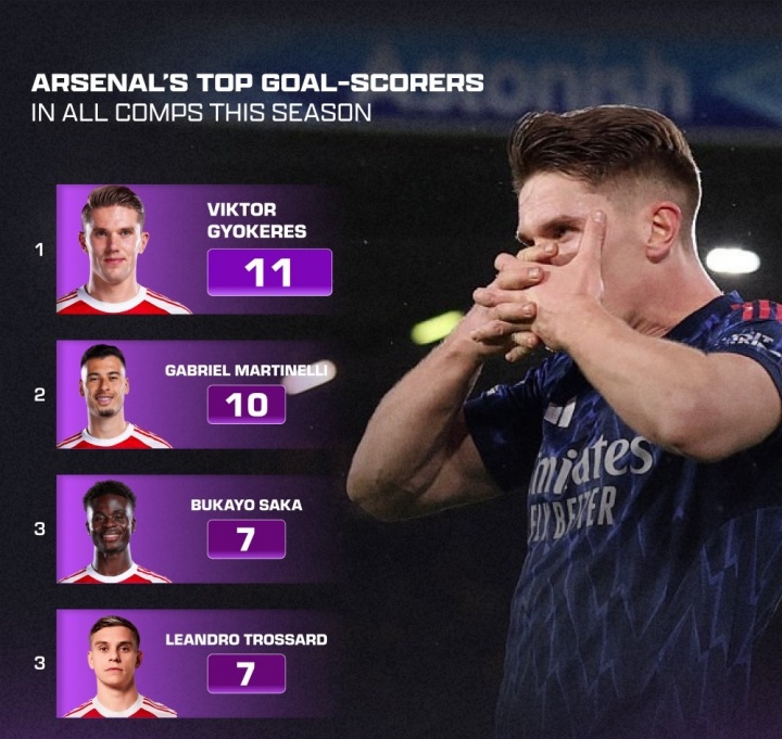 阿森纳本赛季队内射手榜:约克雷斯11球领跑,马丁内利10球