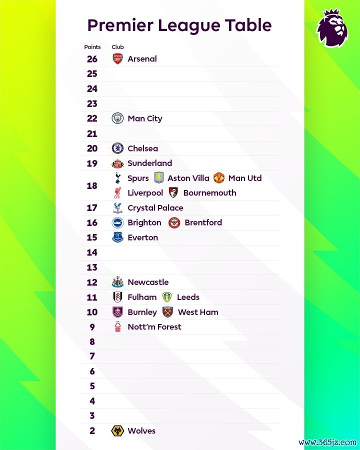 11月12日讯 英超官方晒图英超的“积分榜”,这份榜单以积分为序号,不以排名列出。
