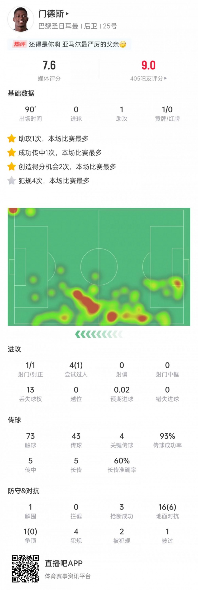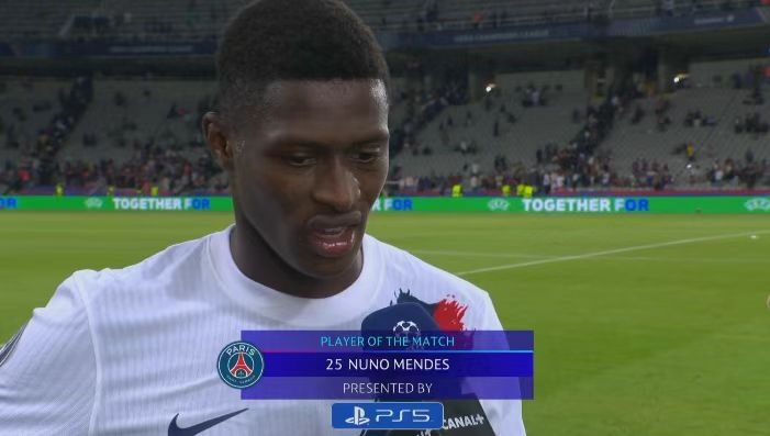 长途奔袭助功 !努诺-门德斯当选巴黎vs巴萨全场最佳球员