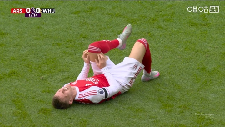 - 枪迷揪心!厄德高开场20分钟膝盖与对手追尾,两度躺在场地内